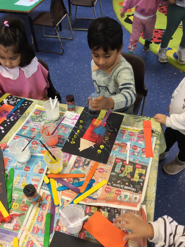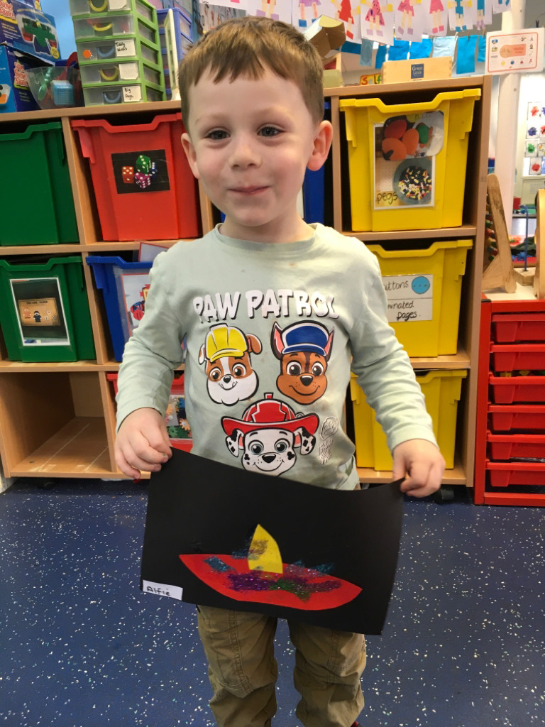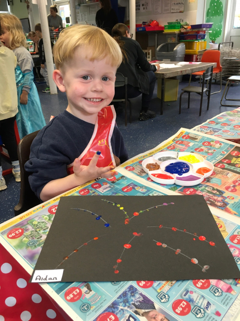We learnt about firework safety with Fireman Sam. Everyone produced firework pictures using different media and artistic techniques.