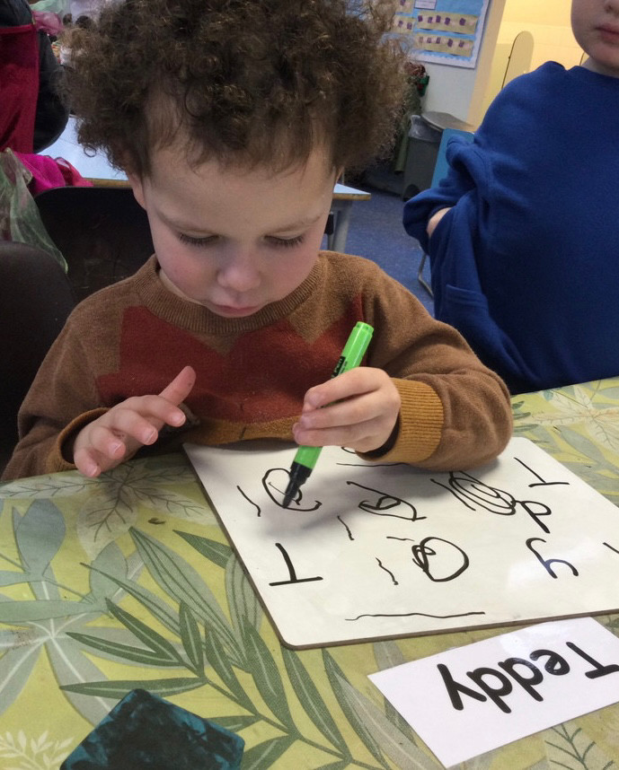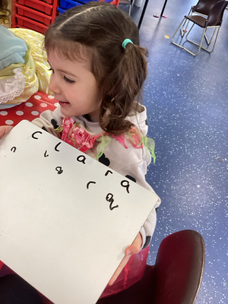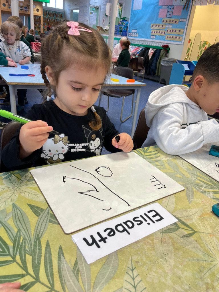 In our literacy lessons we have been recognising, reading and forming the letters of our own names. We had fun painting spots over our written names with cotton buds and our fingers supporting name recognition and letter formation.