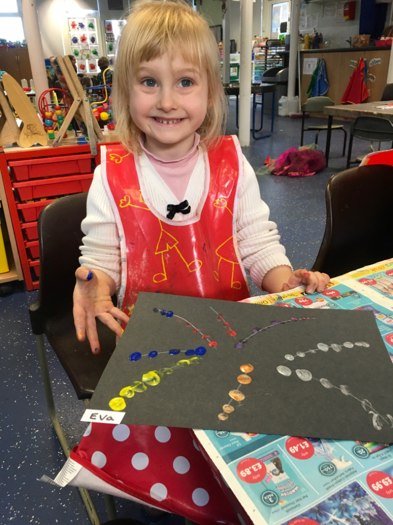 Our stories this week have had a rainbow theme, and have included; Elmer and the Rainbow, Maisy’s Rainbow Dream and Mo’s Smelly Jumper.