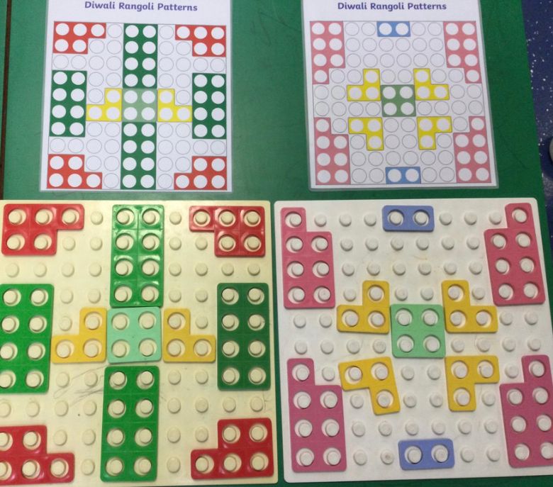 To support our understanding of Diwali, we made diva lamp pictures, drew Mendhi patterns on a hand template and copied Rangoli patterns using the Numicon number shapes.