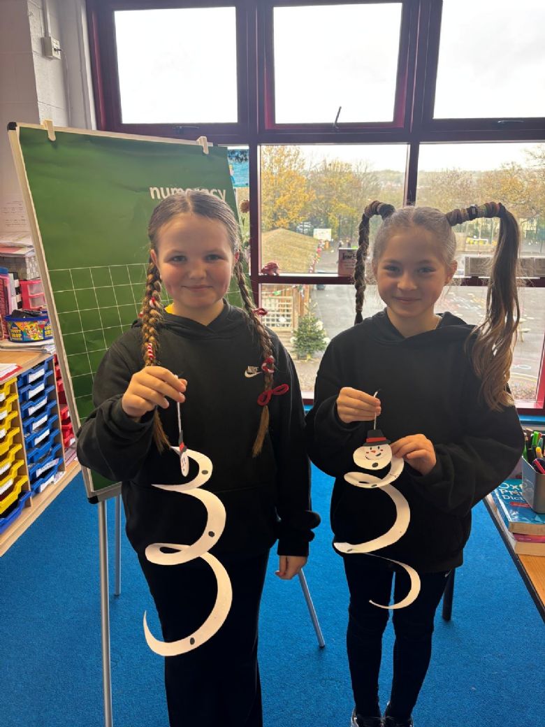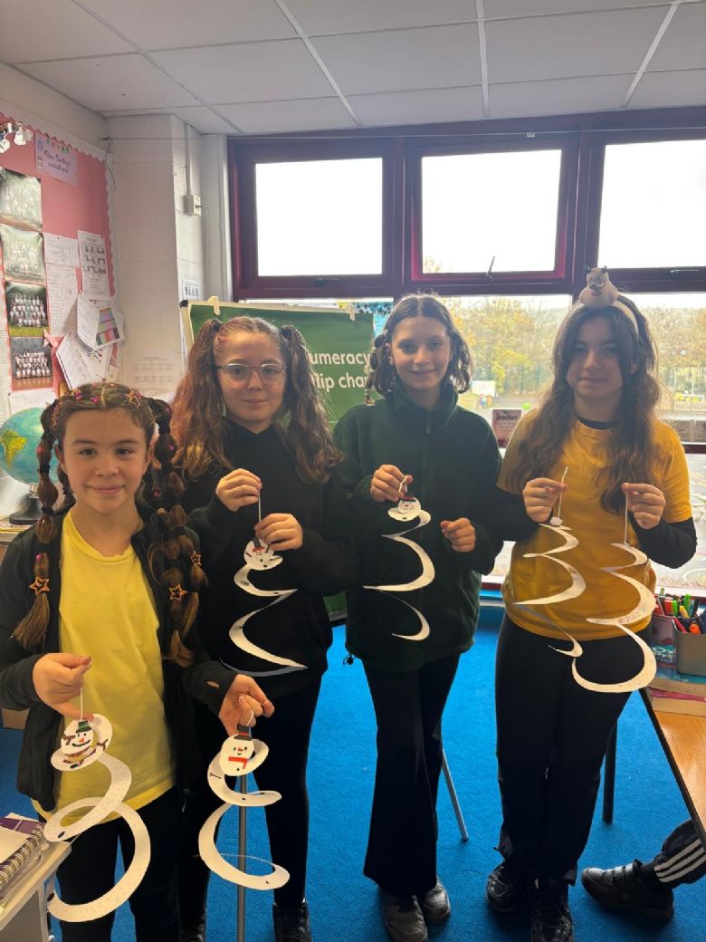 After the fascinating assembly, we started our No Pens Day, a day of fun and talk - lots of speaking to improve our oracy skills. We had maths challenges on the playground, Macbeth drama in English and Christmas art in teh afternoon - we created lovely, spiral snowmen, ready for the Main Hall in school.