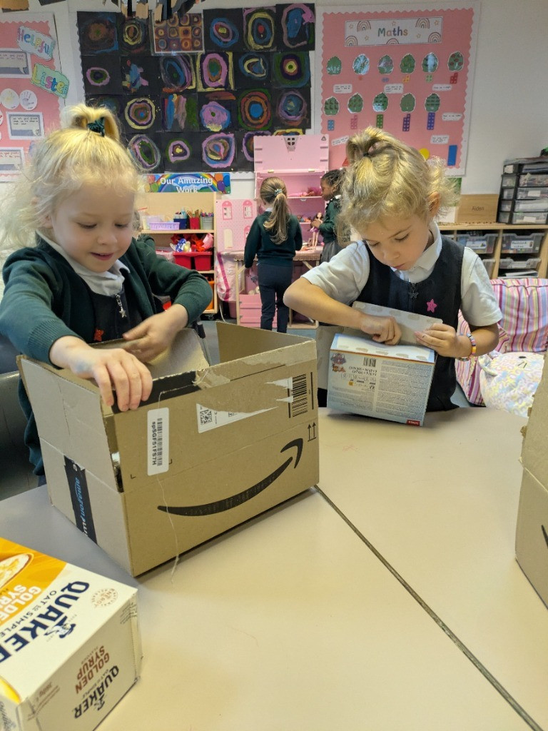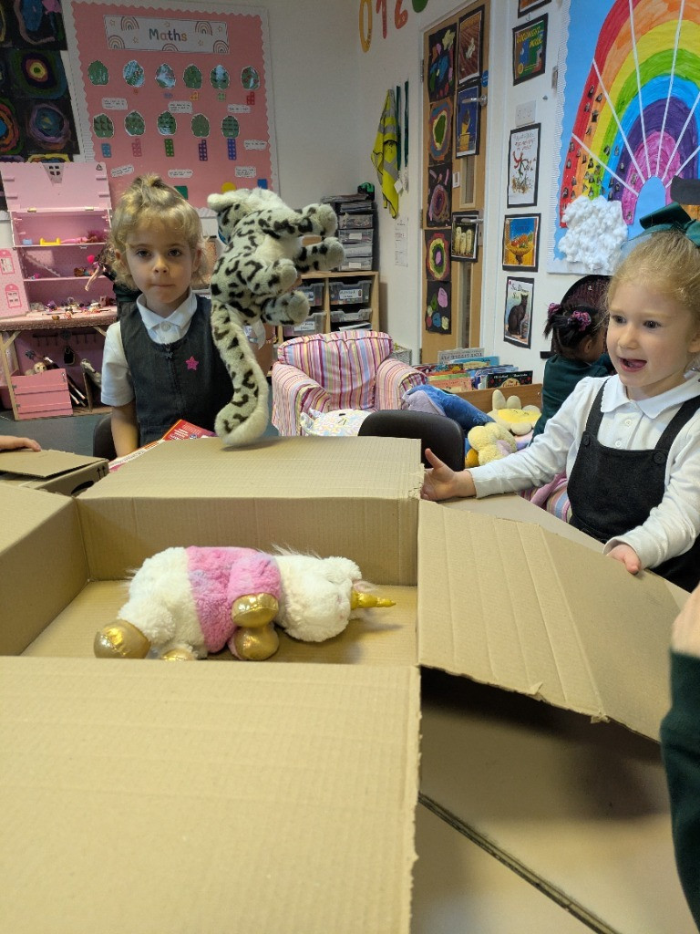 Our maths focus this week has been all about capacity and patterns. The children problem solved in small groups to work out which animals would fit best in each different sized box, thinking about the appropriate size for each animal.
