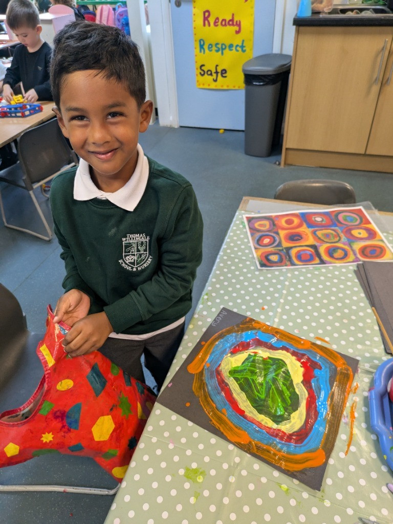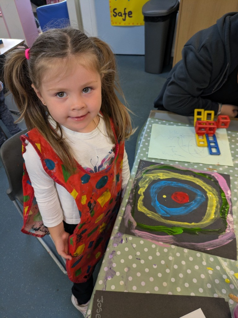 The children have also created lovely abstract pieces of artwork inspired by the artist Kandinsky using square paper and colourful circles. This has developed their fine motor control to paint a series of circles and developed their understanding of colours.