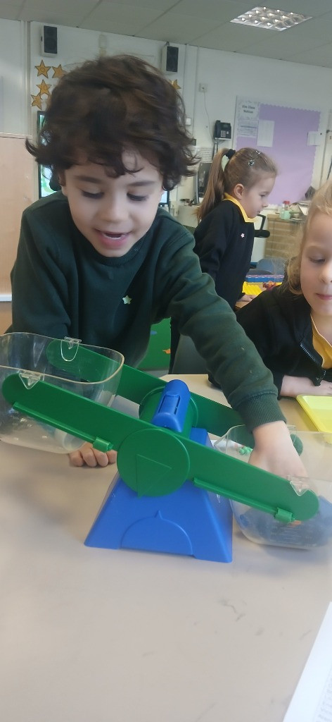 In maths, children have been comparing different sizes and using the balance pans to compare different masses. We have been using lots of different vocabulary, including heavy and light.