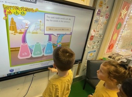 This week the children in reception have been very busy. Both classes have been learning the letter sounds s,a,t and p and the tricky word I. The children have also enjoyed the interactive story A Wet Walk.