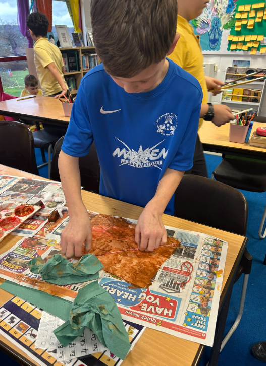 In year 5 this week, we continued our fraction work in maths (and were lucky enough to play some maths games to consolidate our learning). We have started learning about earthquakes, we even replicated an earthquake drill! The children have demonstrated lots of interest in this topic and are showing themselves to be keen and curious geographers. In PE, we enjoyed a whole cohort session, in which we practised scoring goals in handball. When the weather improves, we look forward to taking our lessons outside. In art, we created some unique, abstract pieces that represent earthquakes. We used paint and string to create these unusual pieces of art.