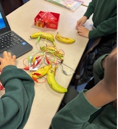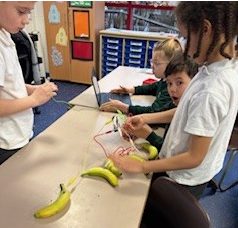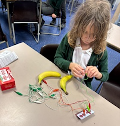 We have been using Makey Makey to set up circuits to play tunes on the bongos and piano.  We made a Banana Keyboard using conduction.