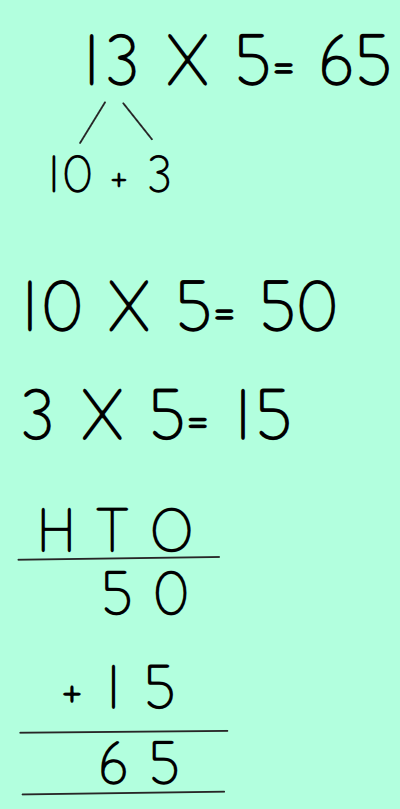 We partition the number into tens and ones and then multiply both parts of the number.  To make it easier, the children need to be fluent in their timestables, in particular 2s, 5s, 10s, 3s, 4s and 8s.