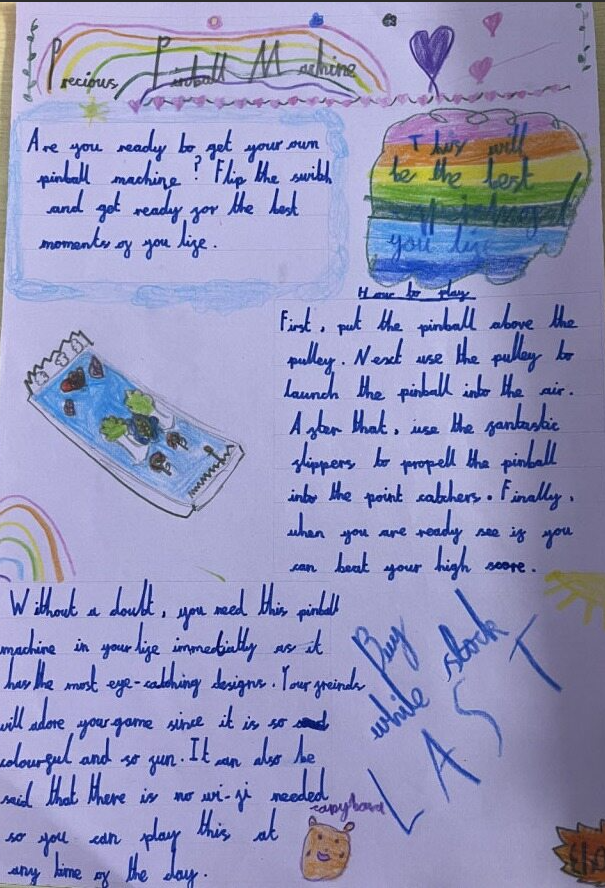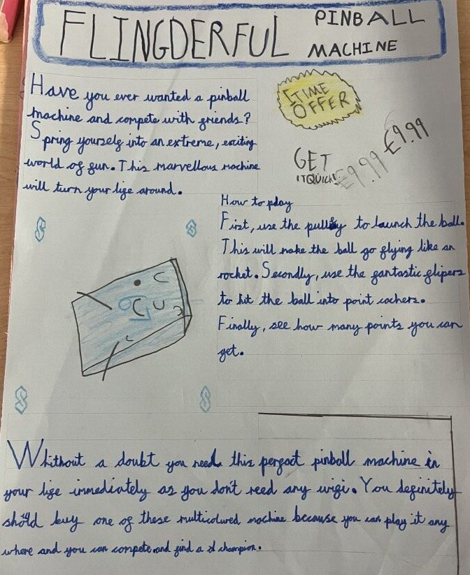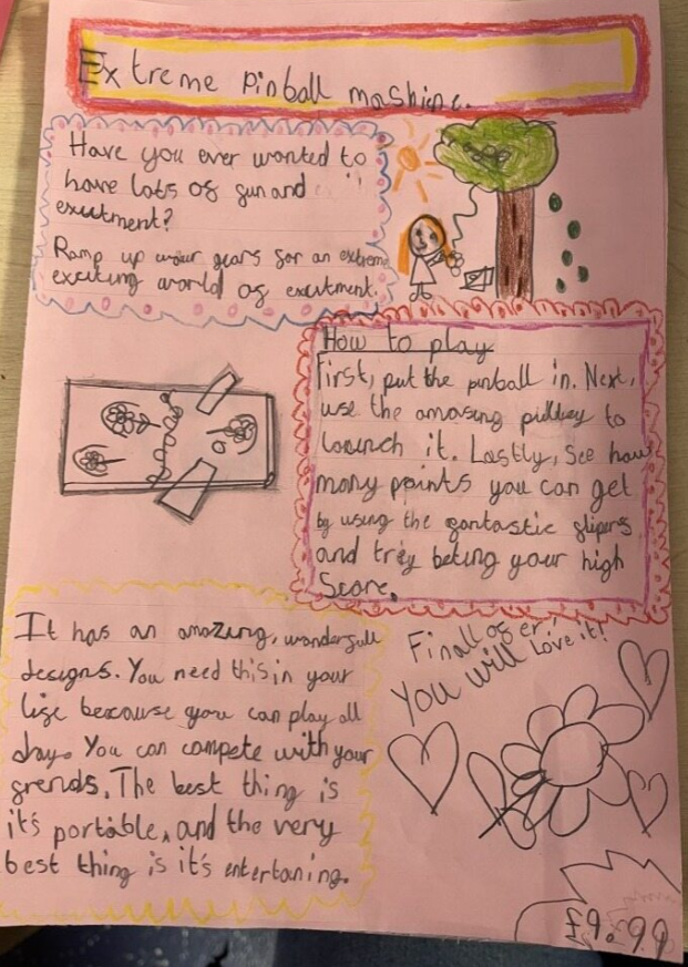 In English, we have been learning about persuasive leaflets and have planned our own leaflet to advertise a pinball machine.
