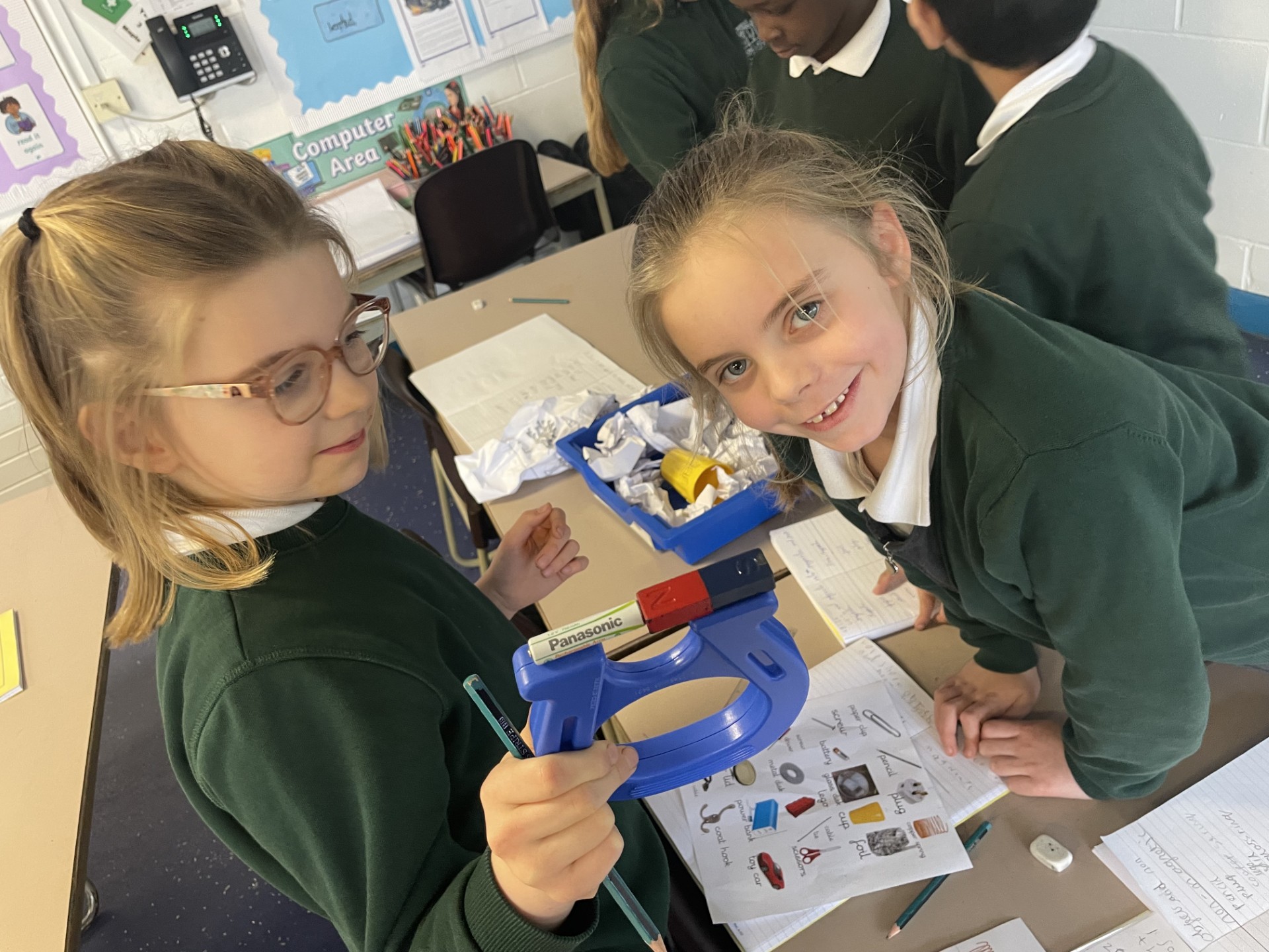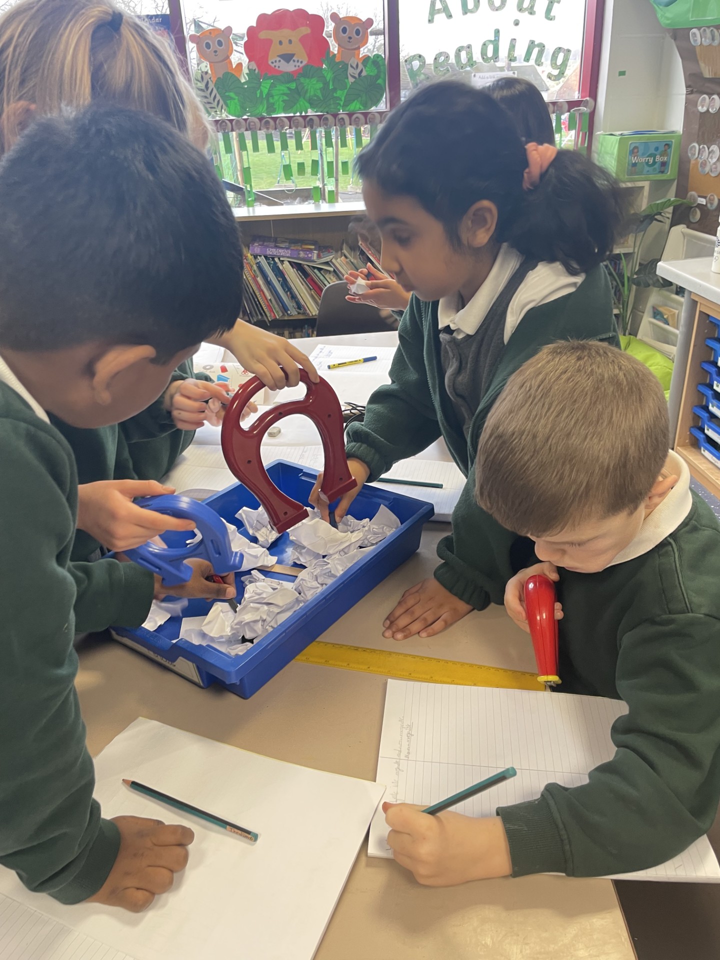 In Science, we have been exploring magnets.  We set up a scrapyard and used magnets to test out which objects are magnetic or non-magnetic.