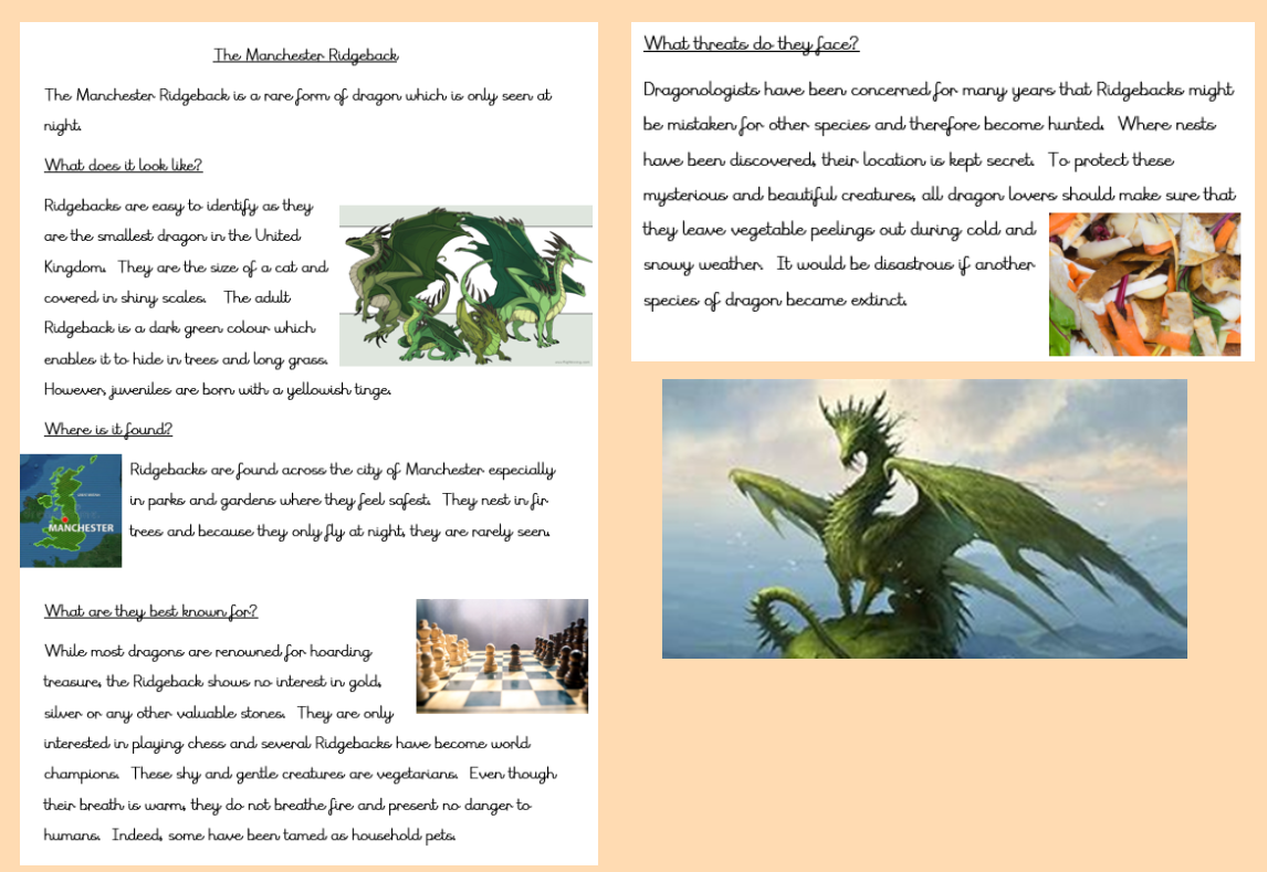 This week, in English, we have been learning about non-chronological reports. We read all about the Manchester Ridgeback. We then created our own dragons and next week we will be writing a non-chronological report about them.