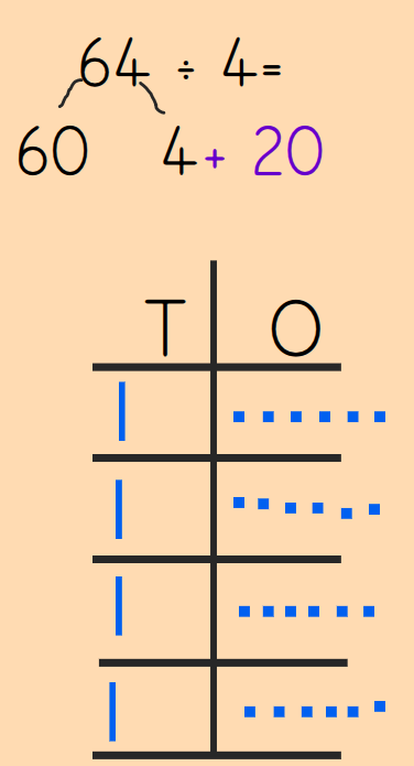 In maths, we have been using a partitioning method to divide 2-digit numbers by 1-digit.   We partition the number and then divide the 10s and ones by the divisor.  Then add up the total.