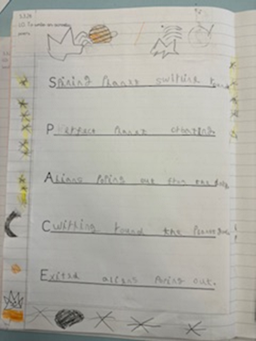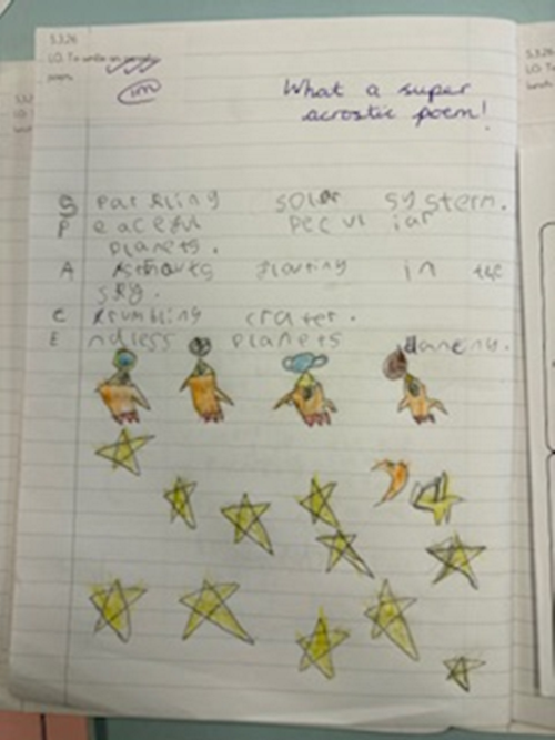 In English, we have been learning about acrostic poems. An acrostic poem is a type of poem where the first letters of each line spell out a word or phrase when read vertically. We learnt about the different features, which include alliteration and similes. We then planned our own acrostic poems about space, which was great fun. Then we had great fun writing our poems.